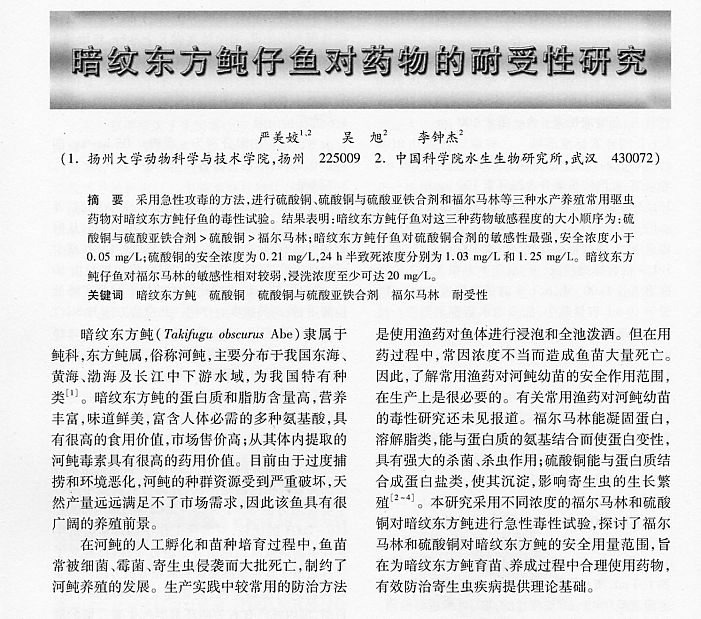 暗紋東方鲀仔魚對(duì)藥物的耐受性研究