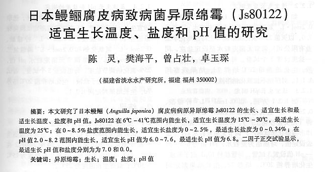 日本鰻鱺腐皮病致病菌綿霉(Js80122)適宜生長(zhǎng)溫度、鹽度和pH值的研究