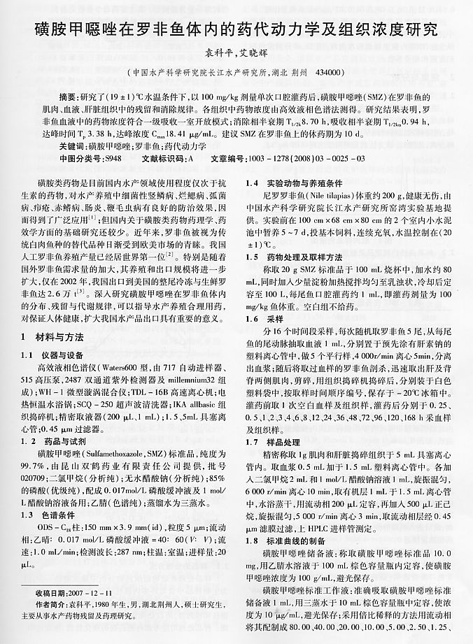 磺胺甲噁唑在羅非魚(yú)體內(nèi)的藥代動(dòng)力學(xué)及組織濃度研究1