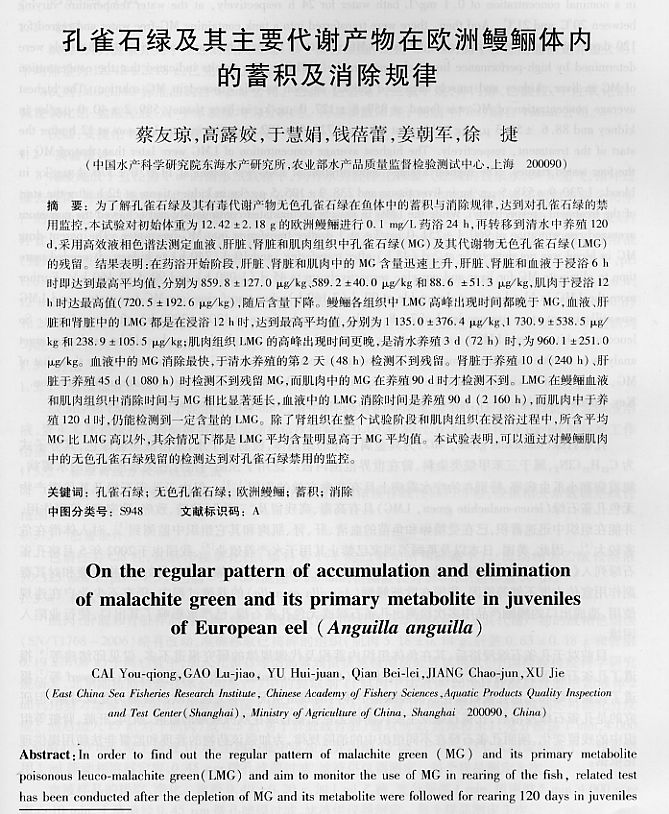孔雀石綠及其主要代謝產(chǎn)物在歐洲鰻鱺體內(nèi)的蓄積及消除規(guī)律1