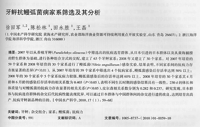 牙鲆抗鰻弧菌病家系篩選及其分析