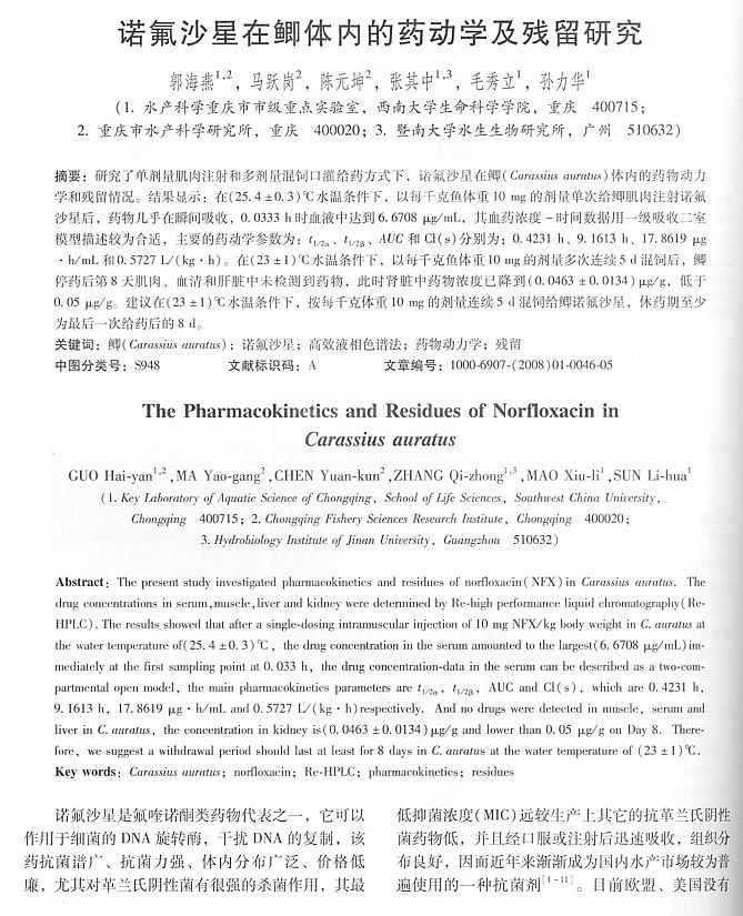 諾氟沙星在鯽體內(nèi)的藥動(dòng)學(xué)及殘留研究1