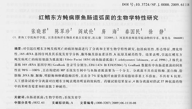 紅鰭東方鲀病原魚腸道弧菌的生物學特性研究