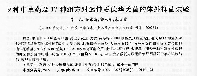 9種中草藥及17種組方對遲鈍愛德華氏菌的體外抑菌試驗