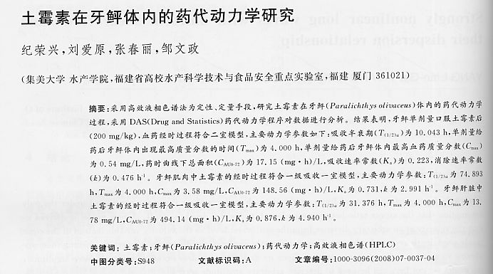土霉素在牙鲆體內(nèi)的藥代動力學(xué)研究1