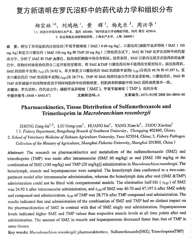 復(fù)方新諾明在羅氏沼蝦中的藥代動(dòng)力學(xué)和組織分布