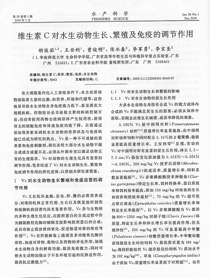 維生素C對(duì)水生動(dòng)物生長(zhǎng)、繁殖及免疫的調(diào)節(jié)作用1