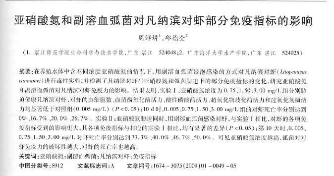 亞硝酸氮和副溶血弧菌對(duì)凡納濱對(duì)蝦部分免疫指標(biāo)的影響